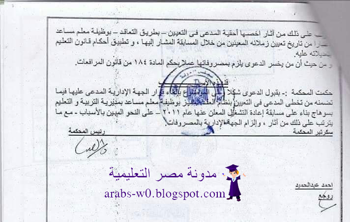 حكم المحكمه الاداريه بتوظيف من سبق له العمل مدرس بالحصه قبل 2011