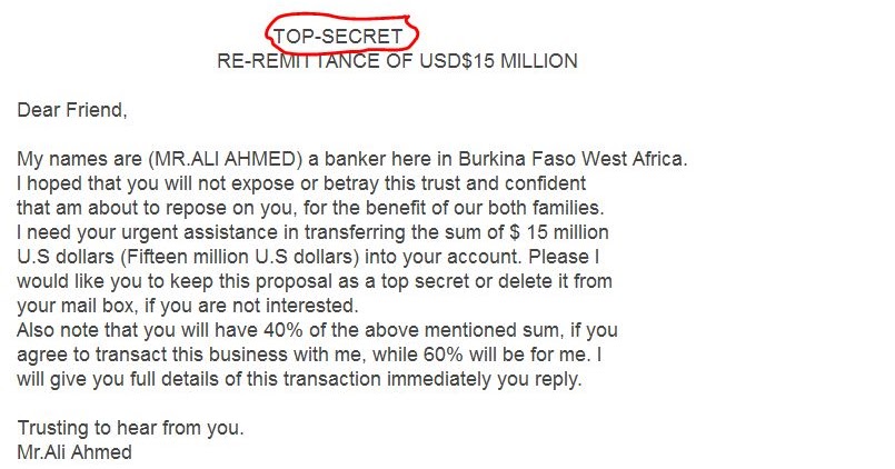 لمعلوماتك طرق الخداع و نصب و احتيال عن طريق رسائل البريد الالكتروني الرسالة التي وصلتني و تعدني بتحويل 15 مليون دولار أمريكي لحسابي